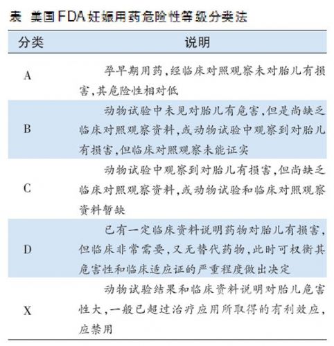 医师在为患者处方时往往会综合考虑药物对妊娠和胎儿的潜在影响。目前我国尚无有关妊娠用药安全的分级标准。美国食品与药物管理局(FDA)的妊娠安全用药分类方法(见表)受到全球广泛关注与借鉴,是指导临床安全用药的重要标准。医师处方和药师审核过程中可以此为参考,结合患者孕周情况,评价患者用药的安全性。尽管如此,实际工作中,在医师处方环节仍会出现错误。