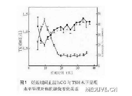 妊娠期母体血清甲状腺素结合球蛋白( TBG) 增加、血清hCG 水平增高、胎盘Ⅱ型、Ⅲ型脱碘酶活性增加、肾脏对碘的清除率增加。在妊娠第8 ~14 周hCG 水平明显增高可以导致垂体- 甲状腺轴的抑制,而在部分妊娠妇女特别是多胎或病理妊娠者以及存在滋养细胞肿瘤的患者,hCG 水平明显升高可导致hCG 相关性甲状腺功能亢进症,报道妊娠妇女的发病率在1. 5% ~11. 0%,似乎亚裔人群发病率更高。hCG 与TSH 均为糖蛋白激素,由完全相同的α-亚基和激素特异性的β-亚基非共价键结合而成,两者完整的三维构也很相似。hCG 结构上的特点使其具有与TSH 受体结合并刺激甲状腺激素分泌的作用。文献报道,妊娠期间血清hCG 与TSH 水平呈现对称的镜像变化关系( 见图1) 。