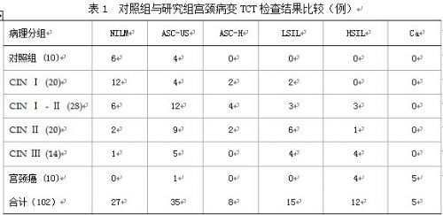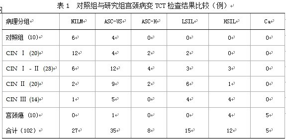 2.1 对照组与研究组TCT结果 所有病例活检前均行TCT检查,结果按照2001年TBS系统( the Bethesda system)进行细胞病理学分类。宫颈鳞状上皮细胞的诊断包括:①未见上皮内病变或恶性病变 (No intraepithelial lesion or Malignant, NILM),包括正常宫颈细胞及炎性改变、反应性改变等良性病变;②鳞状上皮细胞异常:非典型鳞状上皮细胞(Atypical squamous Cells, ASC),又分为意义不明的非典型鳞状上皮细胞(Atypical squamous Cells ofUndetermined Signification, ASC-US)、不能排除高度鳞状上皮内病变的非典型鳞状上皮细胞(Atypical squamous Cells-Cannot exclude HSICL, ASC-H);③鳞状上皮内低度病变(Low-grade IntraepithelialLesinon, LSIL );④鳞状上皮内高度病变(High-grade Intraepitheliai Lesion,HSIL);⑤鳞状细胞癌(SCC)。腺上皮分析包括宫颈细胞和宫内膜细胞癌,分为非典型腺细胞(AtypicalGlandular cel,l AGC )、可疑腺癌、原位腺癌、腺癌(AC)。表1显示对照组与研究组TCT检查结果,10例正常宫颈病例中有4例为ASC-US,占40%(4/10);在CIN和宫颈癌组中NILM占22.8%(21/92);CINⅡ以上病变及宫颈癌中有27例ASC-US,占37.5%(27/72)。