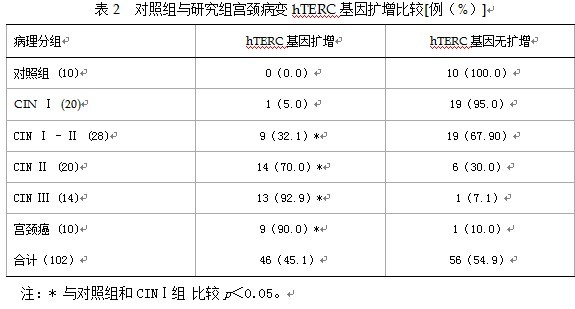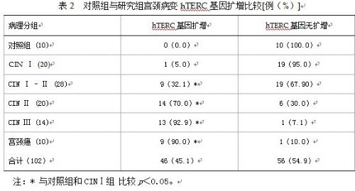 2.2 对照组与研究组hTERC基因扩增结果 FISH技术检测宫颈石蜡切片hTERC基因扩增阳性细胞正常阈值的建立及结果判定标准参照宫颈脱落细胞检测方法[5],以异常细胞数/计数细胞总数≥5为hTERC基因扩增阳性。表2显示对照组和研究组中CINⅠ组与CINⅠ-Ⅱ、Ⅱ、Ⅲ级及宫颈癌组hTERC基因扩增比较有统计学意义(p<0.05),CINⅡ以上病变hTERC基因扩增明显高于CINⅠ及以下病变,随着病变程度递增,hTERC基因的阳性表达率增加。