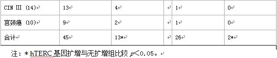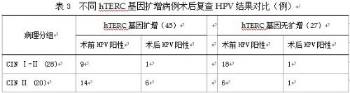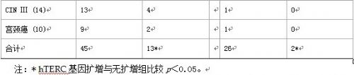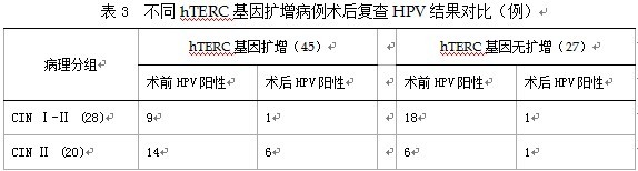2.3 手术前后HPV-DNA检测结果 病理结果在CINⅠ-Ⅱ级以上病变予相应治疗,术后6-12个月复查,共有72例患者行HPV-DNA分型检测,完成随访。表3示手术治疗72例病例中术前HR-HPV感染率达98.6%(71/72),高于文献报导[6],其中45例hTERC基因扩增者术后13例再次出现高危型HPV(high-risk human papilloma viral,HR-HPV)阳性,占28.9%(13/45,其中CINⅠ-Ⅱ1/9,CINⅡ6/14,CINⅢ4/13,宫颈癌2/9),同一亚型占46.2%(6/13),其它亚型占53.8%(7/13)。27例hTERC基因无扩增病例中术后仅有2例出现HR-HPV阳性,占7.4%(2/27),其中1例合并尖锐湿疣,另1例为再生障碍性贫血患者。两组比较具有统计学意义(p<0.05)。
