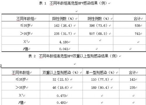 2.3 不同年龄组HR-HPV感染情况 不同年龄组HR-HPV感染结果见表1,两组比较差异有统计学意义(P<0.05),其中≤35岁组最常见的感染型别依次为:HPV-16、-52、-58、-53和-33;>35岁组依次为:HPV-16、-58、-52、-53和-33。不同年龄组双重以上型别感染率结果见表2,两组比较差异无统计学意义(P>0.05),其中≤35岁组多重感染型别依次为:HPV-16、-52、-33、-58和-53;>35岁组依次为:HPV-16、-52,-58,-33和-53。
