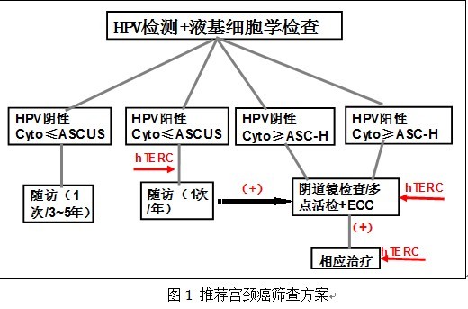 宫颈高级别病变及宫颈癌治疗后需要严密随访。对此,2011年NCCN宫颈癌筛查临床指南中有明确规定,CINⅡ、CINⅢ或宫颈癌存在病变持续或复发高危因素者在初次治疗后需每年进行筛查至少20年。三阶梯的诊断方案对于治疗后的筛查具有一定的局限性。首先,宫颈的解剖形态已被破坏,锥切后宫颈转化区回缩入宫颈管内,给细胞取材及阴道镜评估带来困难。其次,部分患者经过化学治疗或放射治疗后,卵巢功能下降,阴道及宫颈上皮菲薄,上皮细胞数量不足以判断结果,或者出现一些反应性改变,进一步影响细胞学检查结果的灵敏度。在随访过程中,可以加上hTERC基因的检测,以及早发现病变残留或复发。