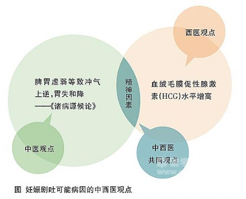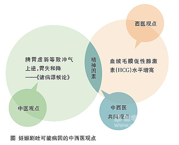 妊娠剧吐发生率约为0.35%~0.45%,多见于年轻初孕妇,其病因尚未明确,中、西医对可能病因有不同看法,也有相同观点(图)。