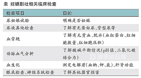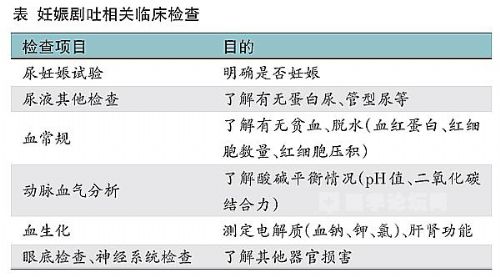 妊娠剧吐临床表现差异较大,常须进行相关检查以协助了解病情(表)。绝大多数患者经治疗后可痊愈,但严重者可发生水、电解质紊乱,表现为面色苍白、皮肤干燥、脉搏细数、尿量减少,进一步可出现血压下降、肝肾功能损害;患者出血倾向增加,可发生骨膜下出血,甚至视网膜出血;若病情继续发展,可出现嗜睡、意识模糊,甚至昏迷。