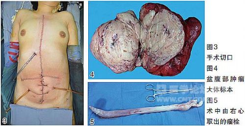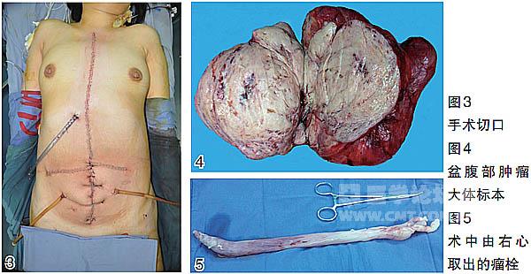 要点 2011年7月19日,患者接受了双侧髂内静脉栓塞术,7月20日接受胸腹联合切口,通过上腔静脉、股静脉及升主动脉插管引流上、下腔静脉及升主动脉建立体外循环,在低温低流量灌注下行下腔静脉、右心瘤栓取出术,然后改为普通麻醉下盆腹部肿瘤切除术+双侧附件切除术+右侧输尿管修补术(图3~5)。病理检查报告示静脉血管平滑肌瘤病。