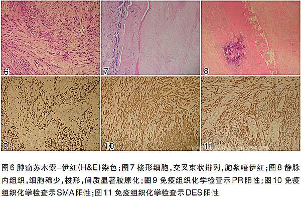 镜下可见梭形瘤细胞呈束状排列,细胞浆嗜伊红,核无明显异型,间质显著胶原化钙化;静脉内组织细胞稀少,梭形,间质显著胶原化(图6~8)。免疫组织化学检查:CK-P(-),PR