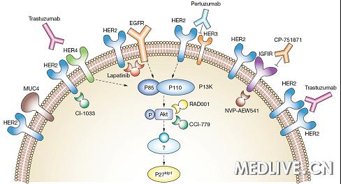 HER2或Erb2是表皮生长因子家族的成员,在乳腺癌、卵巢癌、胃癌、大肠癌、胰腺癌、子宫内膜癌中过度表达。HER2调节细胞信号通过以下几种途径:RAS/ RAF /丝裂原活化蛋白激酶和磷脂酰肌醇-3激酶/蛋白激酶B /雷帕霉素的哺乳动物靶标,并与细胞生存和增殖有关。