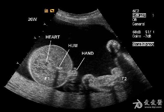 双胎中期妊娠:一胎儿发育未见明显异常,另一胎儿无心畸形并全身皮肤高度水肿。