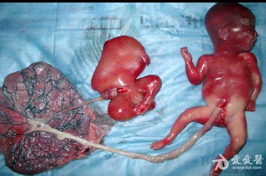 1、双胎中一胎形态、结构发育正常,另一胎出现严重畸形,以上部身体严重畸形为主,可有下部身体如双下肢等结构。