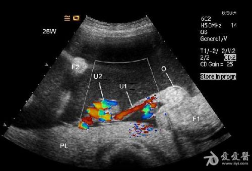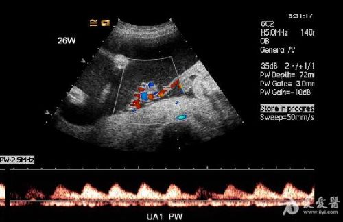 6、频谱及彩色多普勒血流显像可显示无心畸胎脐动脉及脐静脉内血流方向与正常胎儿相反,无心畸胎脐动脉血流从胎盘流向胎儿髂内动脉达胎儿全身,脐静脉血流从胎儿脐部流向胎盘,正好与正常胎儿脐动脉、脐静脉血流方向相反。