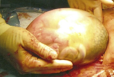 图 胎膜内分娩的新生儿仍被包裹在完好的羊膜囊中。