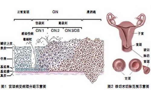 目前治疗宫颈原位癌的方法主要是宫颈锥形局部切除(图2),包括手术刀切除、二氧化碳激光切除及环形电切术(LEEP)等。该方法可保留子宫,保留生育能力,对患者生活状态影响小;而一经确诊为宫颈浸润癌,则须切除宫颈或全部子宫,或行放射治疗,患者因此部分或完全失去生育功能。