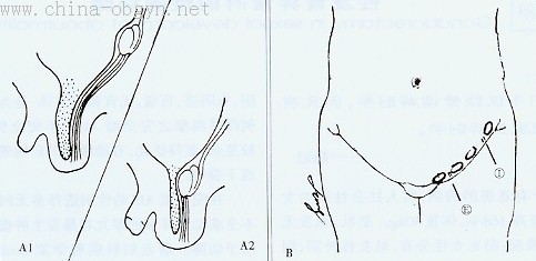 在男性性腺下降(Descent of gonads of the made)一节中指出:睾丸源于生殖嵴,后向腔下降,最终至阴囊。在胚胎3个月时,在盆壁形成vaginal processes,6个月在盆壁(如图A1),进而经腹股沟管内,外环(图A2),到阴囊(9~10个月)。它亦可以停留在下降过程中的某个部位,如图B,便为隐睾。