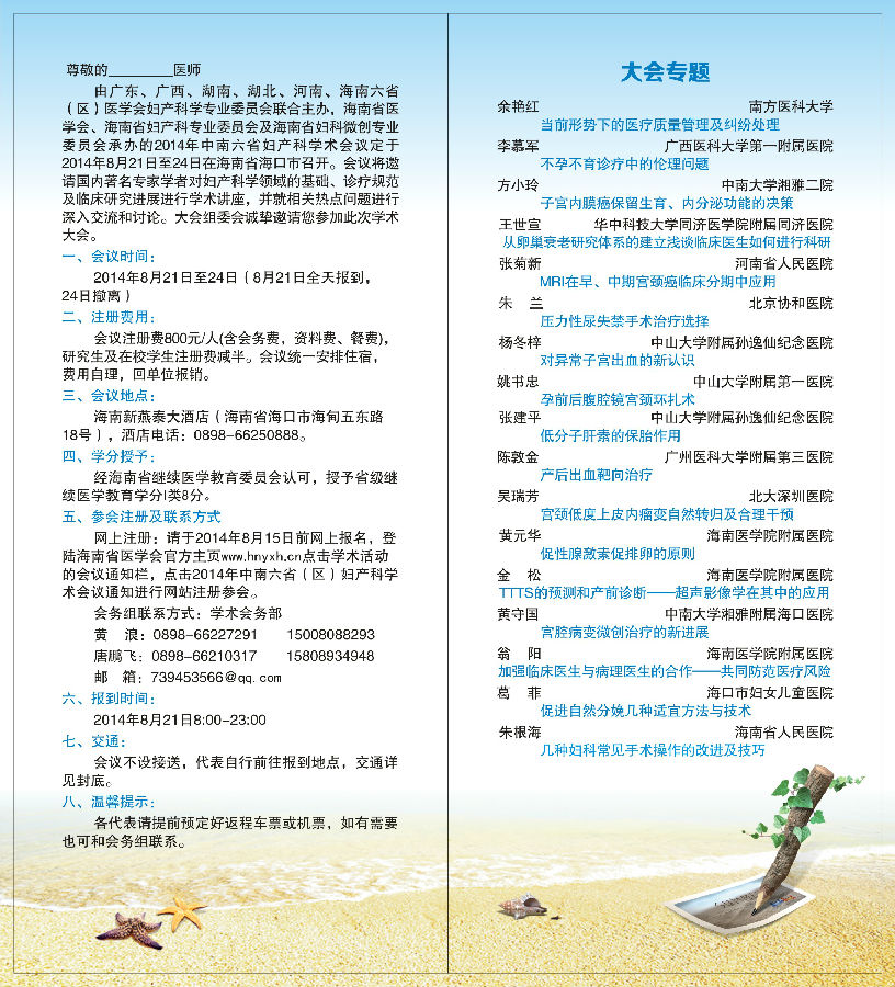 为加强中南六省(区)妇产科学学术交流,展示和检阅近年来所取得的学术成果,提高本地区妇产科学术与临床水平,促进科学发展,由广东、广西、湖南、湖北、河南、海南六省(区)学术会妇产科学专业委员会联合主办,海南省医学会、海南省妇产科专业委员会及海南省妇科微创专业委员会承办的2014年中南六省妇产科学术会议决定于2014年8月21日至24日在海南省海口市召开。会议将邀请国内著名专家学者对妇产科领域的基础、诊疗规范及临床研究进展进行学术讲座,并就相关热点问题进行深入交流和讨论。热烈欢迎妇产科同仁踊跃投稿参会。现将会议的有关事宜通知如下: