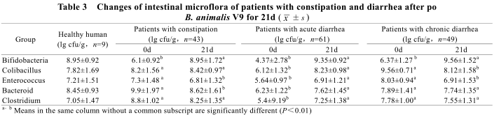 Results The effective rates of B. animalisV9 on patients with constipation, acute diarrhea and chronic diarrhea were95.3%,95.4% and 89.9% respectively after po B. animalis V9 freeze-dried powderfor 3 w, The number of bifidobacteria in fecals increased (p<0.01)significantly compared with 3 w before, and colibacillus, enterococcus,bacteroid and clostridia also changed in different degree and closed to thehealthy men. Conclusion B. animalis V9 can regulate the intestinal microflora andhas communities, had remarkable cured effect on patients with constipation anddiarrhea. [ACTA NUTRIMENTA SINICA, 2011, 33(1):70-74]