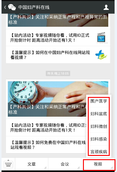 3.在妇产科在线公众微信平台界面中选择“视频中心” 进入后登录"试用ID和密码"即可选择自己想看的视频。