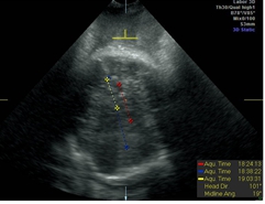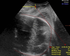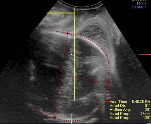 我们采用GE公司的Voluson i便携式超声仪器,对38例经阴道试产,进行了三维超声第二产程监测。从产妇进入第二产程后即开始监测,直至胎头着冠。每间隔15-20分钟在宫缩间歇期进行超声检查。利用SonoVCAD软件对所有图像进行测量,分别由两位医生对数据进行2次重复测量,在同一观察者间及不同观察者间各组测量数据均具有较好的重复性,其中胎头方向角的重复性较进展角佳。在本研究中,有4位产妇进行了产钳助产,其余35位均经阴道自然分娩。产钳助产组中有3例胎头下降距离明显小于自然分娩组,1例胎头助产前抬头进展角小于120。。此外,在正常分娩组中的1例,多次观察胎头中线角为40。,经由助产士徒手旋转胎头后顺利自然分娩。