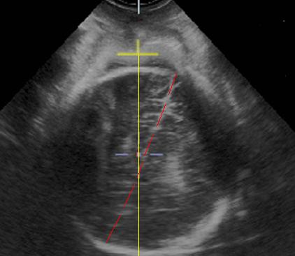 图4.在B平面上描记胎头的中线,中线角为胎头中线与耻骨联合下缘垂线的夹角