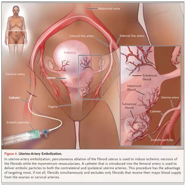 介入治疗:参见图4。对照研究发现子宫动脉栓塞和手术相比可以获得类似的生活质量。主要合并症也和手术类似,但是小合并症的风险更高,需要额外手术干预(经常是全子宫切除)的风险更高。合并症包括发热和疼痛(一系列症状被称为栓塞后综合征),阴道排出肌瘤组织等。治疗的绝对禁忌证包括:妊娠,可疑癌症,活跃的感染。肌瘤变性的女性不能从介入治疗中受益。对于后续妊娠的影响以及对卵巢功能的破坏等考虑,限制了栓塞的广泛应用。对照研究发现,手术治疗要比介入治疗的分娩率更高,流产率更低。栓塞vs.全子宫切除后12-24个月,卵巢储备功能没有差别。系统性综述发现栓塞导致的卵巢功能异常主要发生在45岁以上的女性。