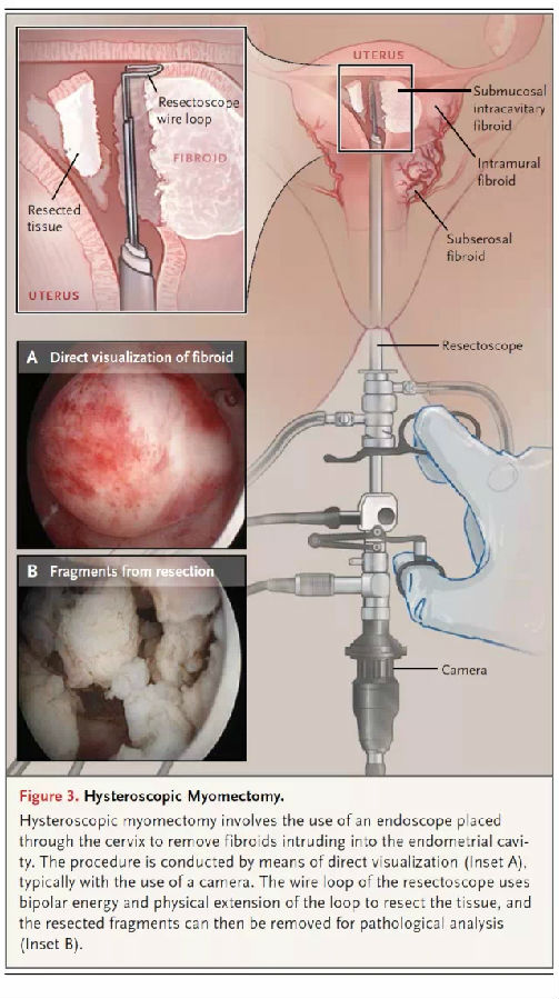 治疗单纯的经量过多:有限的证据支持氨甲环酸和左炔诺孕酮宫内缓释系统(LNG-IUS)可以治疗肌瘤导致的经量过多。临床研究没有发现氨甲环酸导致血栓,但它不能和口服避孕药同时应用。粘膜下肌瘤的女性LNG-IUS排出率较高(12%)。观察性研究支持口服避孕药减少肌瘤患者的出血量。对于RCT的荟萃分析认为非甾体类消炎药和安慰剂相比,可以减少痛经和经量过多,但是效果不如氨甲环酸或LNG-IUS。对于绝大部分粘膜下肌瘤、且宫腔内成分较多的患者(FIGO 0型和1型),宫腔镜肌瘤剔除是最好的治疗(图3)。门诊治疗可让患者在术后数天返回工作,且能增加临床妊娠率(但是和活产率的关系尚不清楚)。对于完成生育的女性,内膜消融术也是合适的治疗,对于FIGO 0-2型的肿瘤,消融术可以和剔除术联合应用。消融术后的避孕仍然必要,因为后续妊娠的风险较高(异位妊娠,胎盘异常,早产等)。