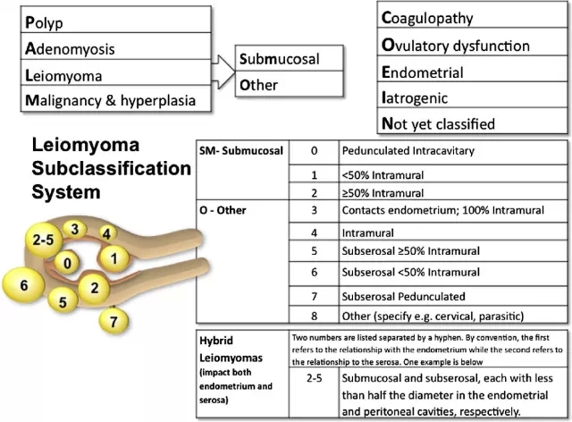 诊断:FIGO有关肌瘤的分型参见下图。超声是诊断首选。增强MRI可以为变性肌瘤提供更多的信息,可以更好地区别肌瘤和内膜、浆膜之间的关系。是否以超声年度监测肌瘤进展,仍无明确证据。一项MRI每半年的检查发现,肌瘤变化从缩小89%到长大138%,中位是增大9%。很多肌瘤会突然增大。指南认为,肌瘤突然增大并不是治疗的指证。出血过多的女性应该评估出血的严重程度和后果,检查血常规和甲状腺功能。选择性的筛查方案包括对认知功能的检查(尤其是von Willebrand’s病,或有相关个人史、家族史)、内膜活检(有内膜癌高危因素的女性,如肥胖,慢性无排卵,应用雌激素治疗但没有孕激素拮抗)。微创术中肌瘤粉碎术所发现的恶变率为1/300,这个数字在小于40岁的女性中其风险为1/1500,40-44岁间为1/1100。类似肌瘤的恶性病变(平滑肌瘤,癌症)的高危因素包括:盆腔放疗史,应用他莫西芬,罕见的遗传综合征等。