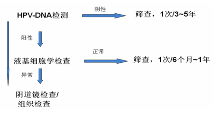 (1)HPV DNA检测——>液基细胞学检查——>阴道镜/活检