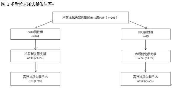206例患者中,62例(62/206,30.1%)出现术后新发尿失禁,其中OSUI阳性组24例(24/45,53.3%),OSUI阴性组38例(38/161,23.6%)(图1),有统计学差异(RR=2.3;95%CI,1.8-7.3;P=0.000)。随访期间共13例(13/206,6.3%)新发尿失禁患者需再次抗尿失禁手术,其中OSUI阳性组10例(10/45,22.2%)、OSUI阴性组3例(3/161,1.9%),其余49例(49/62,79.0%)由于尿失禁症状轻、保守治疗有效而未手术治疗。