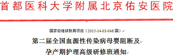 首都医科大学附属北京佑安医院是全国最早建立妇产科的三级甲等传染病医院,是全国规模最大的传染病妇产科,主要收治血源性传染病孕产妇,其核心技术主要包括孕产妇合并重症肝病救治和乙肝、梅毒、艾滋病的母婴阻断,临床诊疗、护理能力及科研水平在国内同行业中走在学术前沿;是北京市指定的高危孕产妇转诊会诊医院,北京市妊娠合并重症肝病抢救中心;艾滋病、梅毒、乙肝母婴阻断诊疗中心。目前,我国除乙肝感染率有所下降,艾滋病和梅毒感染率均呈上升趋势,该类疾病的孕产妇母婴阻断、诊疗及护理成为广大妇产科医护人员关注的热点之一。为给大家搭建学习交流的平台,北京佑安医院将于2015年12月在北京举办“第二届全国血源性传染病母婴阻断及孕产期护理高级研修班”,学习结束授予国家级继续医学教育I类学分,现将具体事宜通知如下: