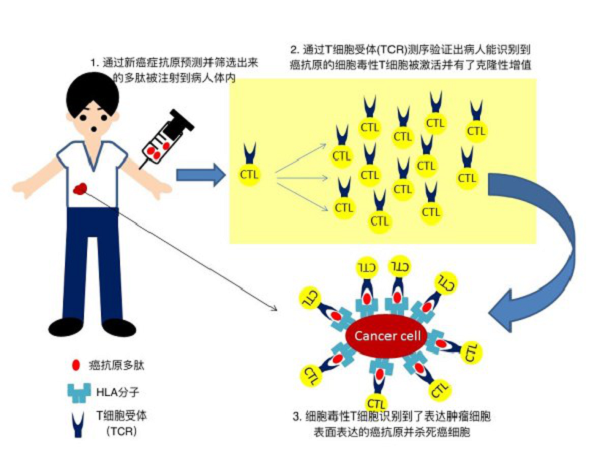 多肽疫苗治疗是免疫治疗的一种,它的目的是通过以多肽疫苗接种的方式来激活病患体内的细胞毒性T细胞。 接种了通过新癌抗原预测出的多肽癌症疫苗,T细胞就能识别肿瘤细胞,并且自我增值后去找到和杀死肿瘤细胞。来自芝加哥大学的中村教授科研组成功的利用多肽癌症疫苗刺激了细胞毒性T细胞来识别和杀死肿瘤细胞。