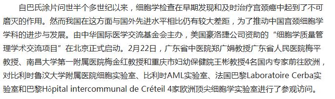 专家团队表示,国外细胞学实验室高效的管理方法值得我国借鉴;高度自动化操作流程也令大家印象深刻,认为这是未来我国细胞学实验室发展的方向。同时专家表示,随着我国宫颈癌筛查和细胞学学术水平的不断提升,我国医生需要更多地与国外高水平实验室进行交流与合作,从而推动我国在细胞学学术方面的发展,使众多的中国女性能够从中受益。