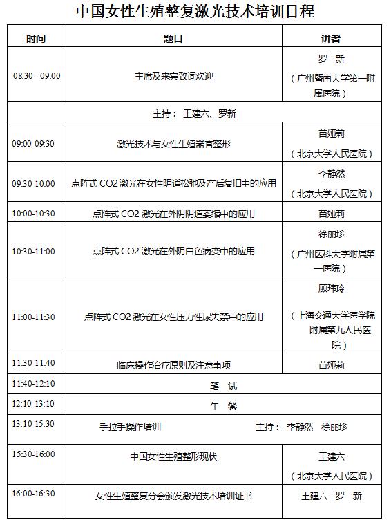 中国整形美容协会女性生殖整复分会已于2015年-2016年开展“中国女性生殖整复激光技术培训(北京、沈阳、上海、广州、郑州等)全国巡讲”。2016年女性生殖整复分会继续举办激光技术培训,以规范激光技术在妇产科的应用。现定于2016年7月17日在广州举行第六次培训班,主要培训内容有理论培训和技术操作培训。理论培训主要有激光技术与女性生殖道整形、点阵式CO2激光在女性阴道松弛及产后复旧、外阴阴道萎缩、压力性尿失禁以及外阴白色病变中的应用、二氧化碳激光临床治疗原则与操作注意事项等。操作培训由激光技术专家对学员进行手拉手激光操作培训,通过培训考核后由中国整形美容协会女性生殖整复分会颁发培训证书。