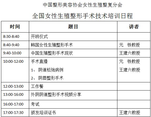 中国整形美容协会女性生殖整复分会将于2016年9月8日举办“全国女性生殖整形手术技术培训(北京站)”学术活动。这次特邀请韩国著名私密整形专家元铁教授及国内著名专家讲授女性生殖整形技术、生殖道畸形整形技术等专题讲座,并有精彩的视屏播放及讲解。培训班采取讲课、手术视频播放及面对面讨论形式,为了保证培训质量和效果,本次培训班限额30名。通过培训考试,可颁发中国整形美容协会女性生殖整复分会培训证书。国家级继续医学教育项目20164204100014。参加此培训学员,可免注册费参加9月9号-11号在北大人民医院举办的第12届北京大学女性盆底重建与私密整形研讨会。