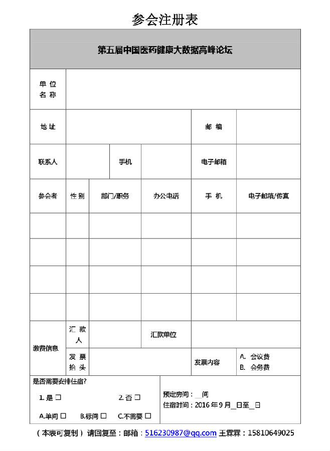 参会人员请于2016年8月30日之前,将会以回执单以邮件或传真的形式回复,并缴纳注册费,以便预留会议席位。回执中需要备注清楚所需发票抬头、内容及邮寄地址,以便会后邮寄发票。
