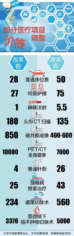 北京市发改委相关负责人表示,这次的价格调整可以概括为“一升两降”,即上调床位、护理、一般治疗、手术、中医等体现医务人员技术劳务价值项目价格,降低了CT、核磁等大型设备检查项目价格,并通过配套取消药品加成和药品阳光采购降低了药品价格。