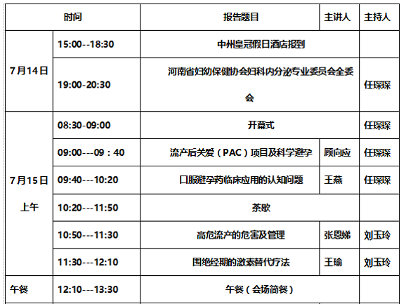2017年7月14日15:00--18:30报到,7月14日19:00-20:30召开河南省妇幼保健协会妇科内分泌专业委员会第二次会议,随后举行妇科内分泌规范诊疗培训班及第三届科学避孕与计划生育服务研讨会。