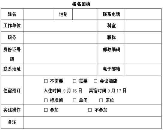 注:敬将此回执以电子邮件至会务组。会务组以2017年9月1日前收到回执名单为准。由于会议期间用房紧张,如需预订房间敬请提前并以会务组电话确认及预付房费为准,逾期者请自行安排住宿,请见谅。