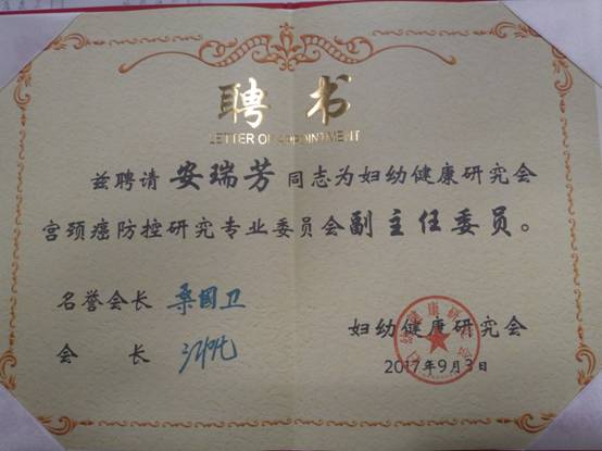9月3日由全国妇幼健康研究会组织的“宫颈癌防控研究专业委员会成立大会暨宫颈癌综合防控专题研讨会”在北京朝阳区顺利召开。会议选举产生了第一届妇幼健康研究会宫颈癌防控研究专业委员会成员并颁发聘书。我院妇产科主任安瑞芳教授当选为“第一届妇幼健康研究会宫颈癌防控研究专业委员会”副主任委员。