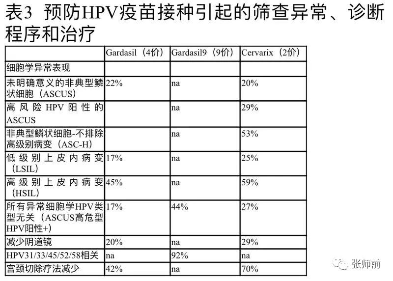 Cervarix二价疫苗和Gardsail9九价疫苗,三剂疫苗预防cin2或任何HPV类型的效果都在62%左右;对于Cervarix二价疫苗而言,任何HPV类型预防CIN3或更高级别病变的效力是93%,Cardasil四价疫苗是43%,没有Gardsail9九价疫苗的数据。这三种疫苗都导致了阴道镜和宫颈切除术数量的减少。随机对照试验表明,与Cardasil四价疫苗相比,Cervarix二价疫苗对于HPV16和18的T细胞和B细胞功能具有较高的免疫原性;没有关于Gardsail9九价疫苗的可比较的免疫原性数据已经接种了HPV疫苗的女性进行再次接种,没有任何证据表明对HPV病毒感染的预防有任何改善。Cardasil四价疫苗和Cervarix二价疫苗在预防25岁以上妇女的HPV 16/18感染或疾病方面的有效性达到90%;在老年人群中,Cervarix二价疫苗对HPV 31和45感染有近70%的功效。结合筛查,可以为这些接种疫苗的女性提供在资源有限和疾病负担沉重的国家减少宫颈癌发病率。