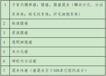 依据WHO/国际病理学会分类,子宫内膜癌组织病理类型如下(须镜下确认)