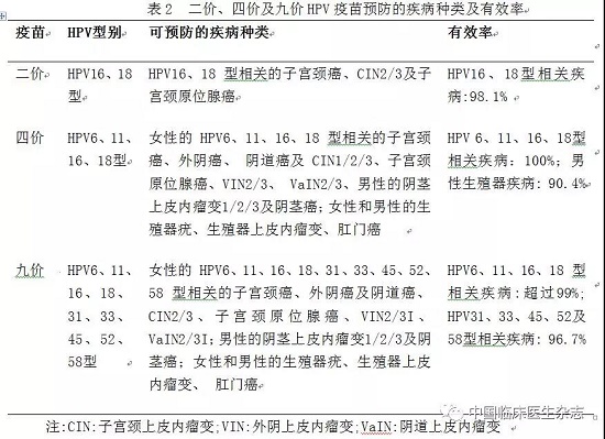 3.3 九价疫苗 九价疫苗是目前可预防HPV感染种类最多的疫苗。1项丹麦的研究评估了丹麦九价HPV疫苗接种的效果,发现九价疫苗能使患者发生宫颈病变(宫颈上皮内瘤样病变2/3级,3级)的风险降低80%。由美国默沙东公司发起的Ⅱb期和Ⅲ期临床试验发现,九价和四价疫苗所产生的针对HPV6/11/16/18型抗体滴度差异无显著性,且九价疫苗对预防HPV31/33/45/52/58型导致的CIN2+、外阴上皮内瘤变(VIN)2~3级和阴道上皮内瘤变(VAIN)2~3级更为有效。