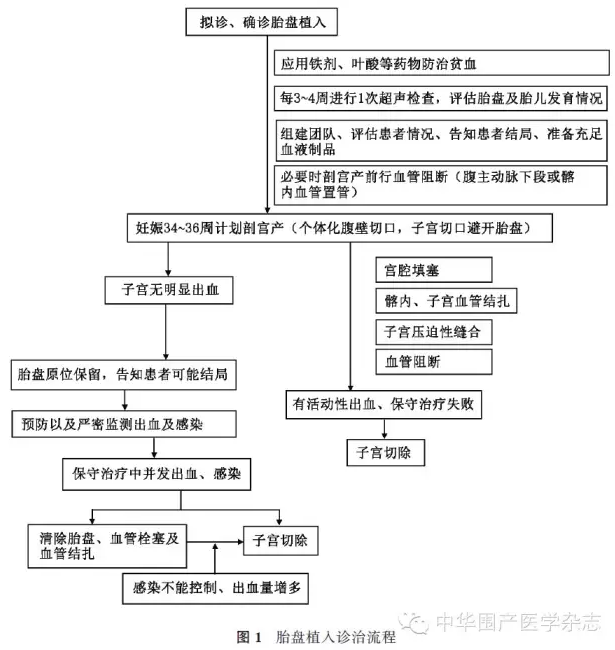 目前,国内外对胎盘植入的诊断与处理缺乏较为完善的循证医学证据,治疗仍存在较多争议。为了满足临床工作的需要,中华医学会围产医学分会、中华医学会妇产科分会产科学组决定联合编写中国《胎盘植入诊治指南(2015)》(简称本指南)。但是,由于国内的研究资料有限,特别是缺乏大样本随机对照试验(randomized controlled trial,RCT)的证据,故以2012年美国妇产科医师学会(American College of Obstetricians and Gynecologists,ACOG)颁布的专家共识[5]为蓝本,结合我国产科临床工作的实际情况制订本指南及胎盘植入诊治流程(图1),旨在规范和指导临床胎盘植入的诊治及管理。