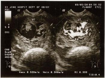 ②声像图表现复杂。宫腔内虽有典型葡萄胎的蜂窝状改变,但因子宫巨大,宫壁菲薄而难以判断该病变来源于子宫;又因子宫巨大压迫卵巢,使子宫和卵巢紧贴在一起没有分界而将子宫内的蜂窝状回声与两侧卵巢的多囊性回声误认为是同一肿块内的不同回声,从而使声像图表现复杂化,造成诊断的困难。