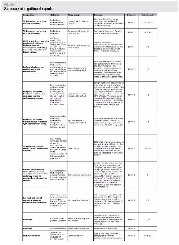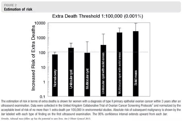 这是AJOG的观点文章,其实是篇小型文献复习。有作者提出,对于附件区异常的超声随访应限于7个月以内。对此,本文作者提出反驳。总结的证据参见图1。作者认为,对于所谓稳定的、结构复杂的盆腔包块(complex cyst/mass)进行系列超声随访可以改善卵巢恶性病变的阳性预测值,并能发现更多的早期病变。已经发现,在初始诊断后至多3年的时间里面,那些稳定的包块最终增大,其形态学上的复杂程度也有所增加。来自United Kingdom Collaborative Trial of Ovarian Cancer Screening Protocols的数据参见图2。图中可见,超声发现的任何卵巢异常其恶性风险都会增加。即使0.001%的可接受风险水平有10倍左右的宽松余地,初次检查后3年内额外的恶变风险仍然恒高。如果这些恶变中≥50%诊断为晚期并注定死亡,那么超声监测可以挽救的死亡病例数很多。作者认为,系列超声检查提供针对这些恶变和死亡风险的保护作用,并降低假阳性率及相关的不必要的手术操作。从病理发生上讲,2型卵巢癌可能起源于浆液性交界性肿瘤或低级别浆液性癌。而囊性畸胎瘤恶变的预后较上皮性癌差。这些情况说明良性和恶性包块之间在形态复杂性上存在交叉,是超声诊断的挑战。另一方面,超声诊断假阳性率带来的风险可能并不像以前估计的那么高,检查本身无害,费用又低。
