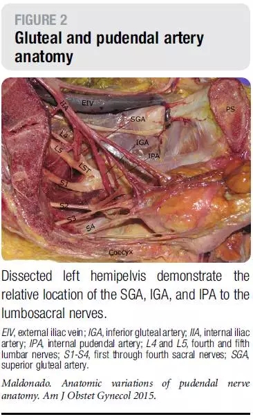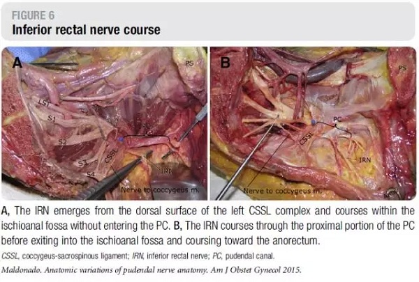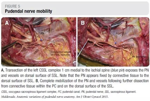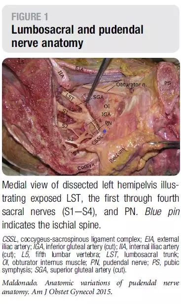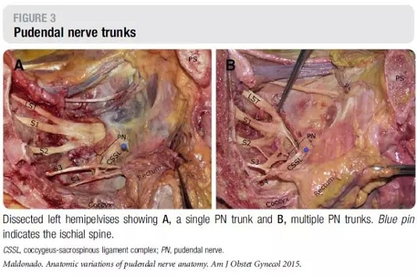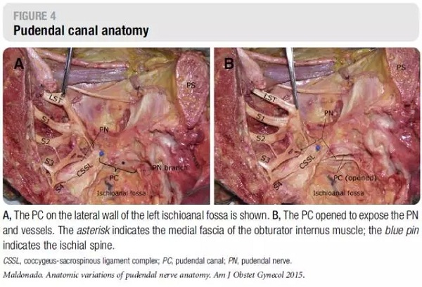 文献引自:MaldonadoPA, Chin K, Garcia AA, et al. Anatomic variations of pudendal nerve withinpelvis and pudendal canal: clinical applications. Am J Obstet Gynecol.2015;213(5):727.e1-727.e6.