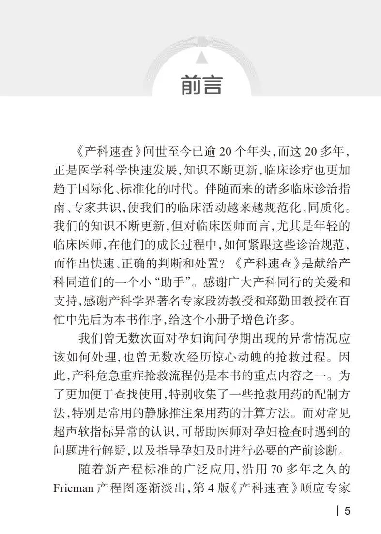 第4版《产科速查》顺应专家共识,在上一版基础上给予更新30%以上,内容包括产科生理常数、新生儿复苏、胎儿宫内监测、常见产科危重症抢救规程、病理状态检查及孕期用药等,新版删除了旧产程图,但依然保留了产程处理常规流程,并在分娩与难产中增加妊娠晚期催产、引产,妊娠合并症中增加妊娠期B族链球菌定植和感染等内容。为了更加便于查找使用,还特别收集了一些抢救用药的配制方法,特别是常用的静脉推注泵用药的计算方法,以及对产前超声软指标异常的识别和简读,可帮助医师对孕妇检查时遇到的问题进行解疑,指导孕妇及时进行必要的产前诊断。