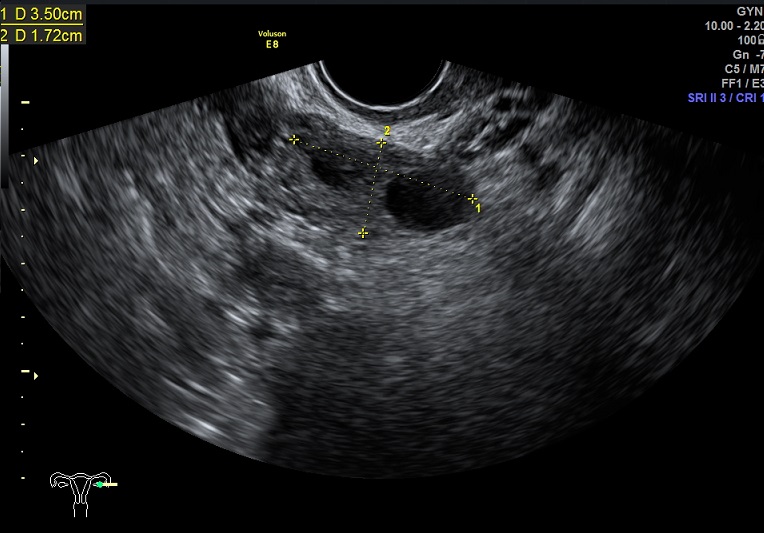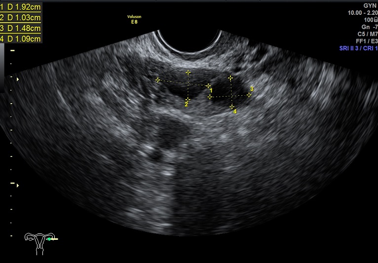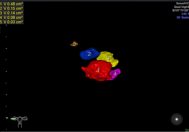 左卵巢: 大小3.5x2.0x1.7cm 体积:6.2 窦卵泡:无 左卵巢见两枚大卵泡:1.9x1.2x1.0cm、1.5x1.2x1.1cm 卵巢间质血流:9.8cm/s RI:0.49