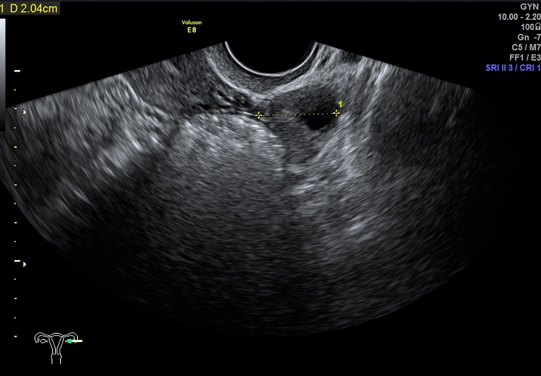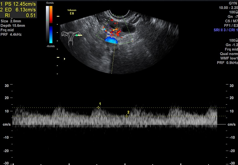 右卵巢: 大小3.3x2.0x1.1cm 体积:5.5 窦卵泡:5 卵巢间质血流:12.5cm/s RI:0.51