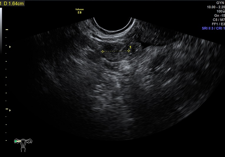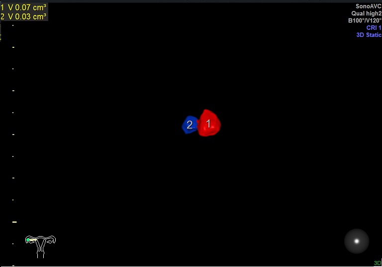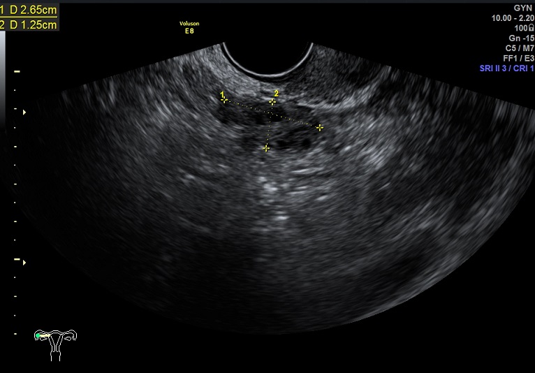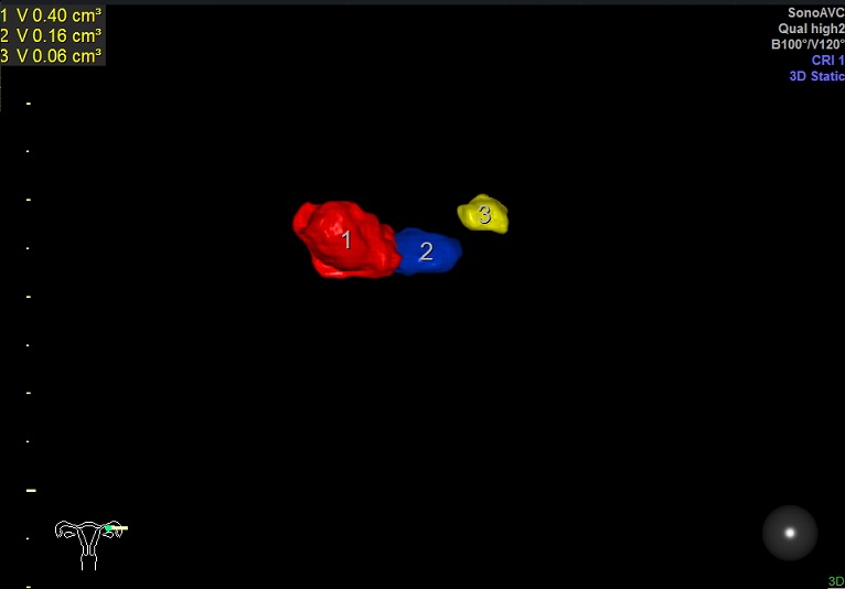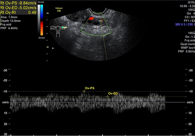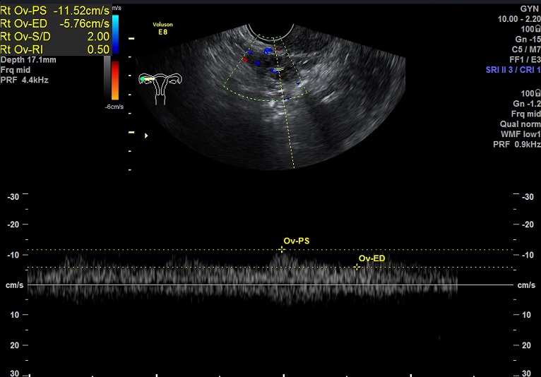 右卵巢: 大小 2.6x1.6x1.3cm 体积:2.8 窦卵泡:2个 卵巢间质血流:11.5cm/s RI:0.52