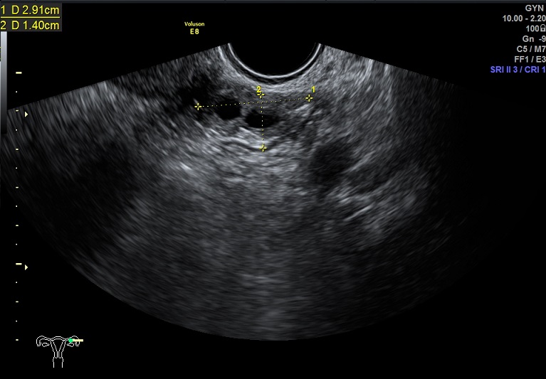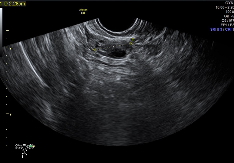 左卵巢: 大小2.9x2.3x1.4cm 体积:4.8 窦卵泡:4个 卵巢间质血流:9.8cm/s RI:0.49